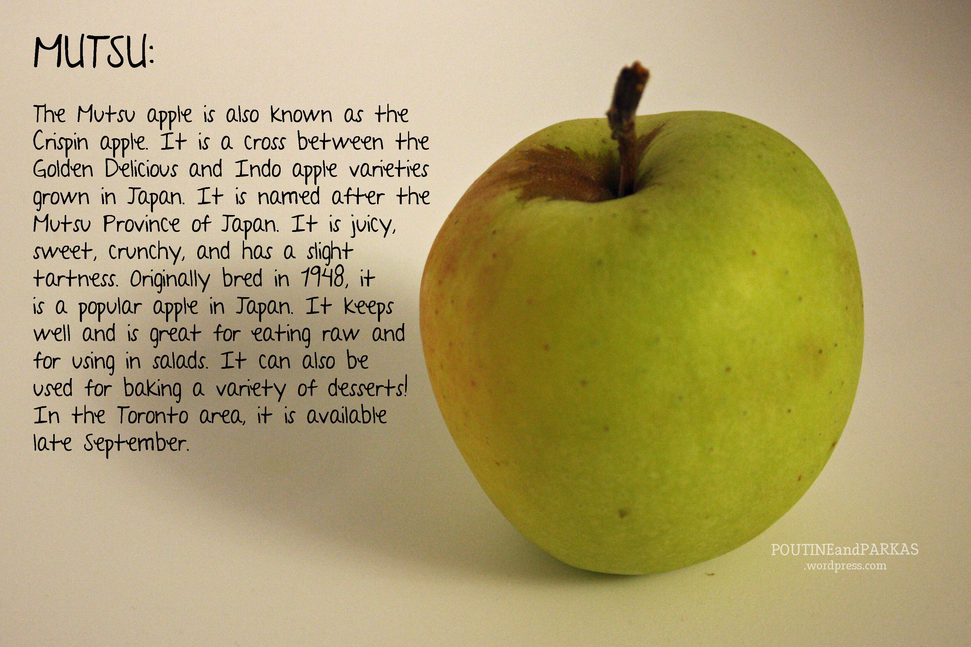 A maçã Mutsu (陸 奥, ム ツ) (também conhecida como Crispin) foi introduzida em 1949 e é um cruzamento entre as variedades de maçã 'Golden Delicious' e 'Indo' cultivadas pela primeira vez na província de Aomori, Japão. O nome da maçã é o antigo nome de uma grande parte da região de Tōhoku, província de Mutsu, da qual Aomori foi criada durante a Restauração Meiji.