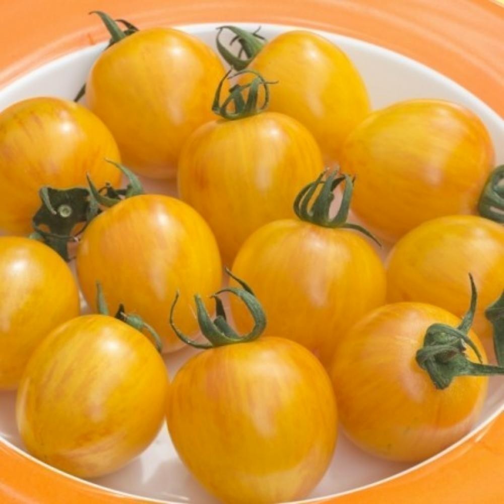 Artisan Golden Bumble Bee är en obestämd variation av körsbärstomater som säkert skapar spänning med dess extraordinära skönhet och suveräna smak. Frukten är gyllene i färg med röda ränder.